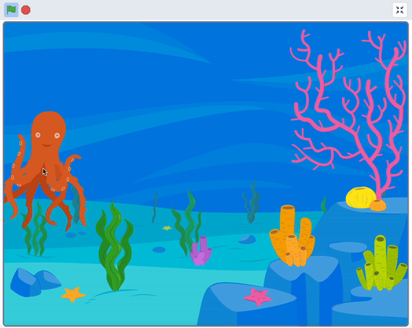 8. Test your project out by pressing the Green Flag. Your Octopus should follow your mouse around the screen, and your Fish should swim around on its own.